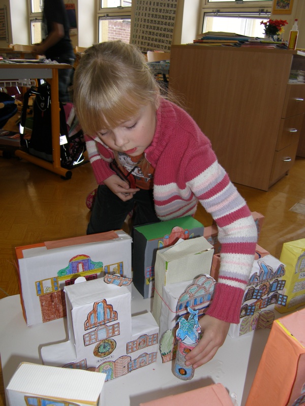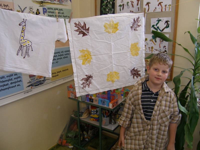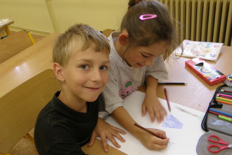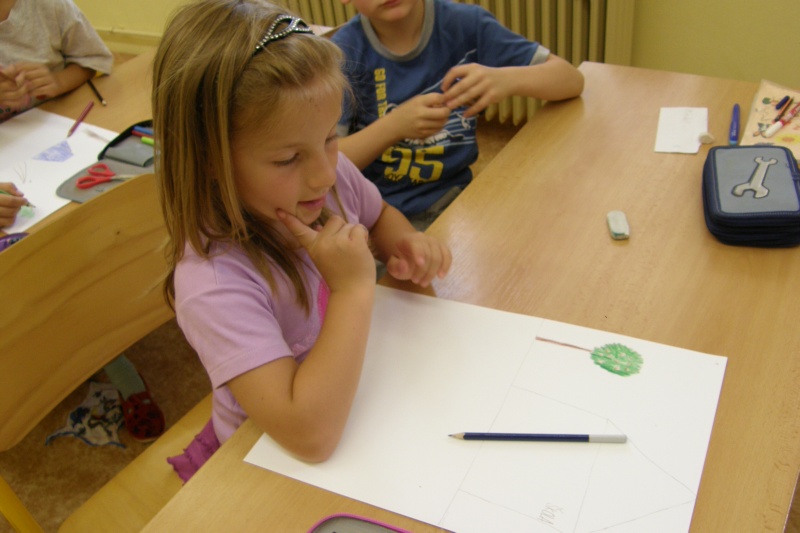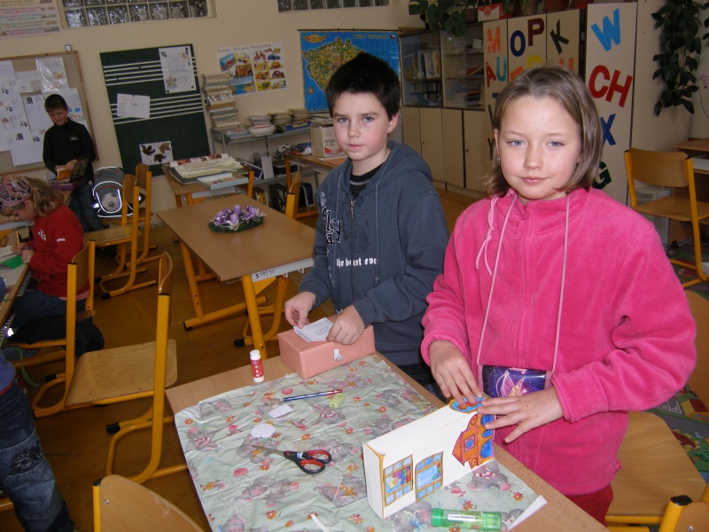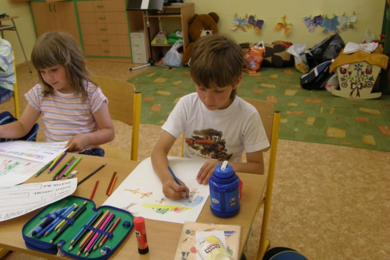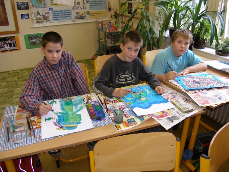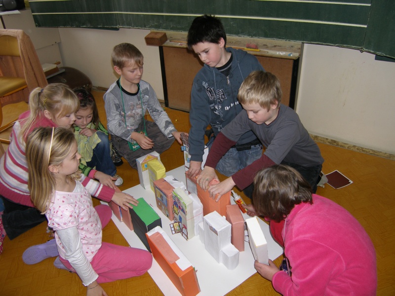 Ve výtvarné výchově děti kreslily louku, do které umístily vystřižené květy, dobarvovaly do obrázků vyjmenovaná slova a v pracovním vyučování sestavovaly z krabiček města.