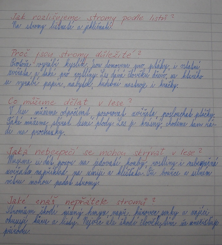 Projekt probíhal ve dnech 8. – 14. června v předmětech prvouka, pracovní činnosti a výtvarná výchova. Jeho cílem bylo přiblížit žákům společenstvo lesa a hlavně zdůraznit jeho význam pro život člověka.