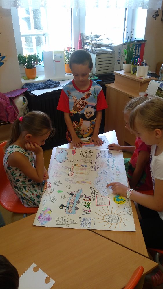 Kraj je to bezesporu zajímavý, obě krajská města mají krásné znaky a my je už umíme namalovat, výstavy proběhly u všech družin. Naši cestu sledujeme na mapě ČR, zaznamenáváme, kde se nacházíme, co zajímavého jsme nalezli, jak se jmenují krajská města a zkrátka plníme zajímavé úkoly. Zasmáli jsme se při hře Třídička, která na počest sourozenců Baťových oslavila návštěvu Zlína. Ve skupinách děti třídily vlastní boty z hromady do párů a rovnaly je zpět vedle sebe. Dále malovaly mašiny, zpracovaly si mapičky a popisují i nadále, co všechno objevují. Pouštíme si zajímavé prezentace a pěkně si povídáme. Těšíme se na návštěvu dalších krajů.