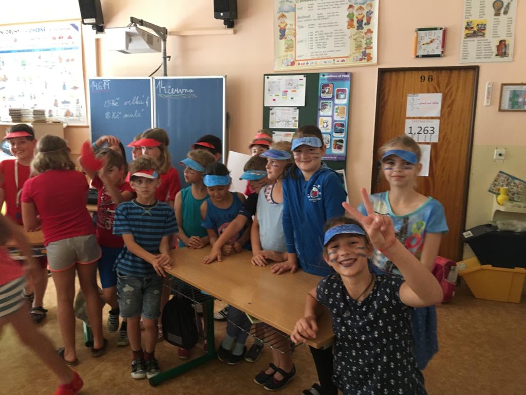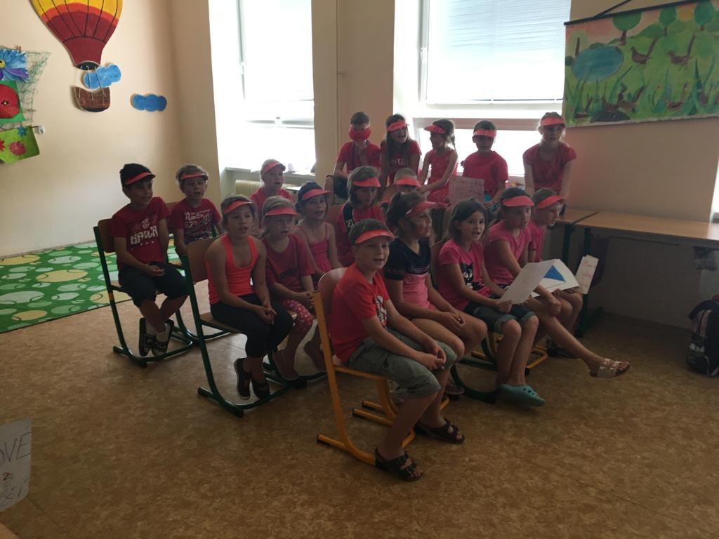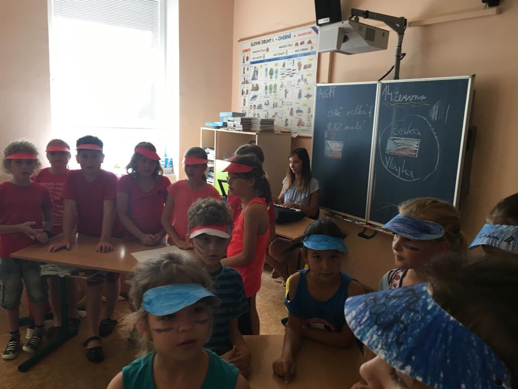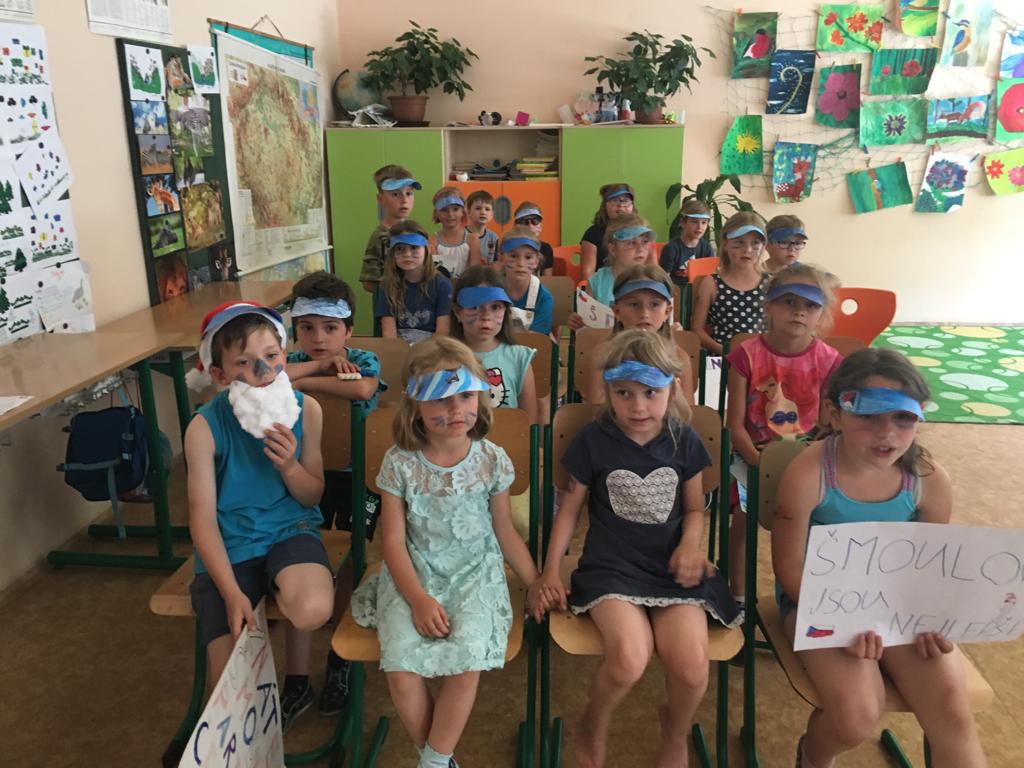 V pátek 14. června 2019 se pak konala soutěž v I. a II. oddělení družiny. I tady probíhaly velké souboje fanoušků v červeném proti fanouškům v modrém. Šmoulové měli krásné transparenty, spoustu pokřiků a velké nadšení. Konkurenti v červeném se nenechali zahanbit. Zkušené moderátorky, paní vychovatelky Ilonka a Ivanka přivítaly všechny soutěžící i diváky. Měly krásné mikrofony a barevně jim to velmi ladilo. Všem připomněly soutěžní pravidla a jednotlivé družiny se pustily do ostrého souboje. Všude se ukázalo nejen spoustu vědomostí, ale i humoru, hry fair – play a spousty smíchu a tleskání. Tyto týmy soutěžily v těchto disciplínách: pantomima, otázky ke krajům, zazpívat a poznat zahranou melodii, otázky s bombou.