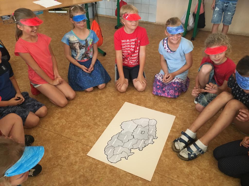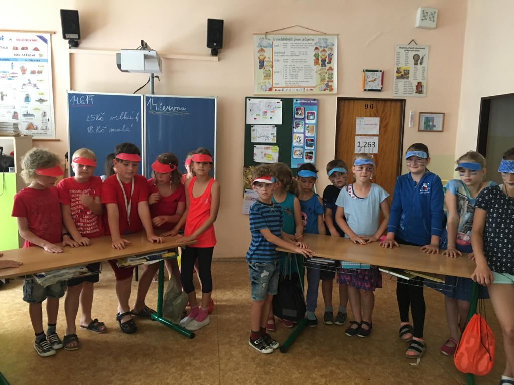 Ve středu 12. června 2019 soutěžila III. a IV. oddělení družiny. Družstva se rozdělila na bílé a červené a vypukl velký boj! Družstva byla namíchaná, tvořena zástupci velkých i malých tříd. Každý tým měl svůj fanklub a také označený stoleček. Pak už nic nebránilo tomu se do toho pustit. Naše dvě moderátorky – Meda a Viky (4. A) přivítaly všechny přítomné a vysvětlily pravidla. Soutěžili jsme v těchto disciplínách: pantomima, poznávání znaků kraje, přiřazování lístečků s názvem kraje, krajského města, pamětihodností a dalších měst. Poslední disciplína pak rozhodovala o vítězi. Mezi soutěžícími kolovala herní tikající bomba a s každým předáním padla záludná otázka. Pokud soutěžící věděl, podal bombu dál. Komu zůstala v ruce a „vybuchla“, prohrál a bod dostal soupeř.